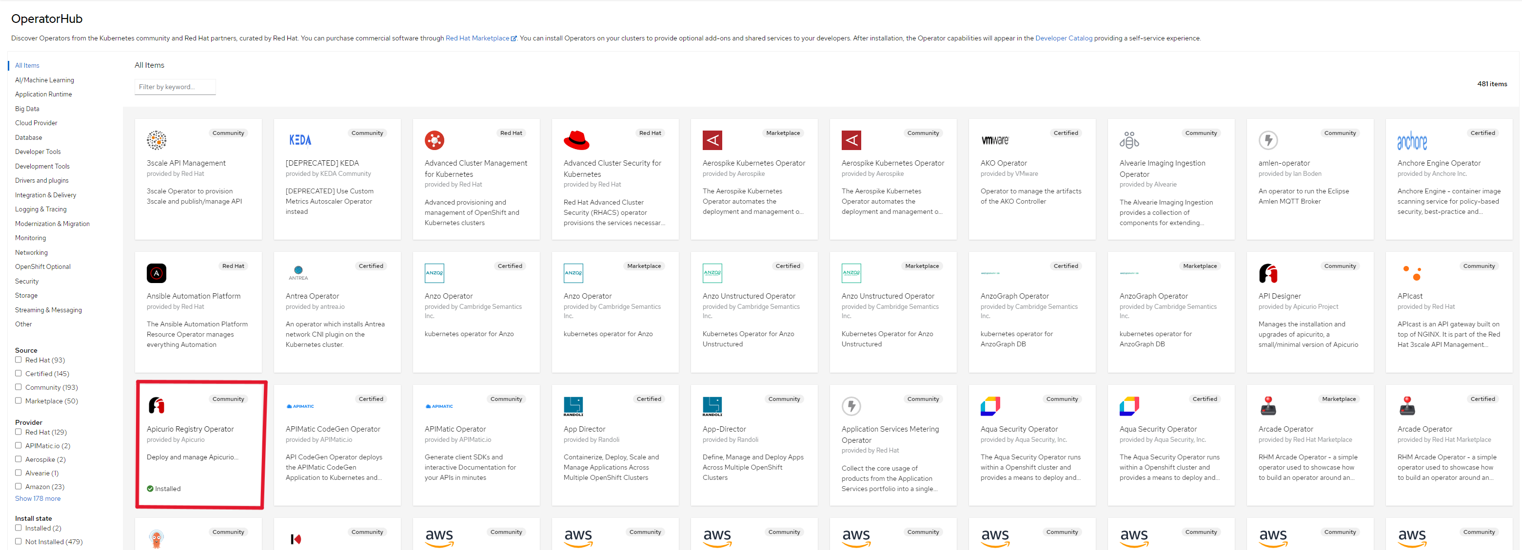 You might ask yourself, what is an operator in Kubernetes? Kubernetes operator is an application-specific controller that extends the functionality of the Kubernetes API to create, configure, and manage instances of complex applications on behalf of a Kubernetes user. In simpler terms, Operators enable us to view applications as single objects that expose adjustments that make sense for that specific application, and not a collection of primitives (Pods, Deployments, Services, and ConfigMaps). The Operator’s role is to reconcile the actual state of the application with the state desired by the resource definition (CRD) using a control loop in which it can automatically scale, update, or restart the application. Apicurio Operator is available on Kubernetes version 1.19 or newer and Openshift version 4.6 or newer.